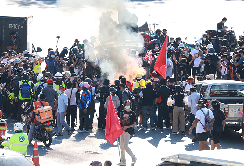 ม็อบ เผาหุ่นจำลองผู้ป่วยโควิด ก่อนคลื่อนไปทำเนียบ ขณะตำรวจนำตู้คอนเทนเนอร์ สกัด