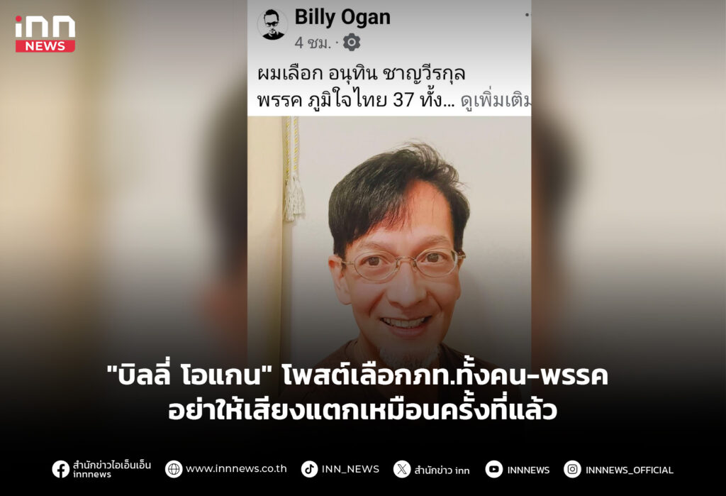 “บิลลี่ โอแกน” โพสต์เลือกภท.ทั้งคน-พรรค อย่าให้เสียงแตกเหมือนครั้งที่แล้ว
