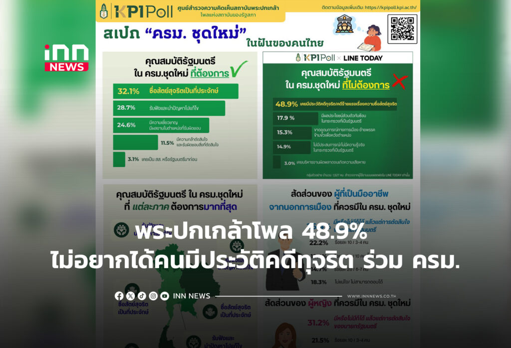 พระปกเกล้าโพล 48.9% ไม่อยากได้คนมีประวัติคดีทุจริต ร่วม ครม.,32.1% ต้องการคนซื่อสัตย์สุจริต เป็นที่ประจักษ์