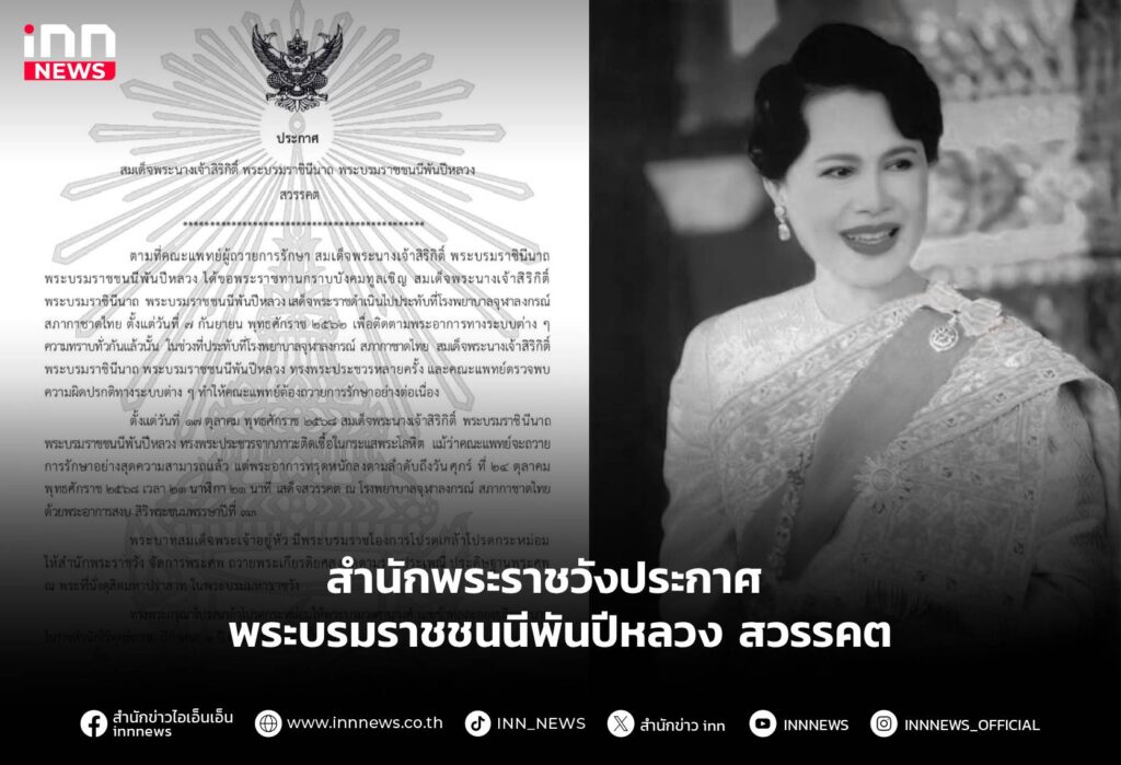 สำนักพระราชวัง เผยแพร่ประกาศ สมเด็จพระนางเจ้าสิริกิติ์ พระบรมราชินีนาถ พระบรมราชชนนีพันปีหลวง สวรรคต