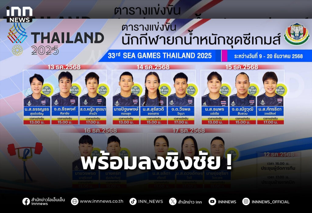 “ธีรพงศ์ ศิลาชัย”และ “สุรจนา คำเบ้า” พร้อมด้วย “ธรรญธร สุขข์เจริญ” พร้อมขึ้นเวทีชิงชัยวันแรกชิง 3 เหรียญทอง กีฬายกน้ำหนัก ซีเกมส์ ครั้งที่ 33 วันที่ 13 ธ.ค. 68 นี้