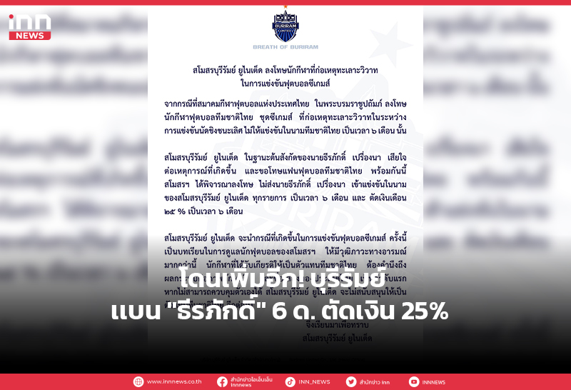 โดนเพิ่มอีก! บุรีรัมย์ เเบน ”ธีรภักดิ์” 6 ด. ตัดเงิน 25%