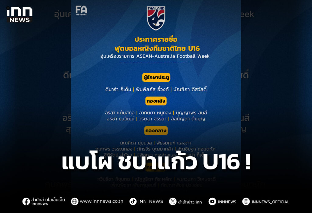 ประกาศรายชื่อ 22 แข้ง ฟุตบอลหญิงทีมชาติไทย U16 ศึกอุ่นเครื่อง ASEAN-Australia Football Week ที่ออสเตรเลีย