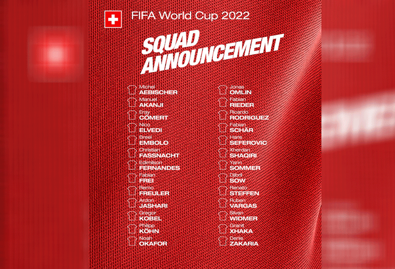 กรานิต ชาก้า, เซอร์ดาน ชากิรี่ และ ริคาร์โด้ โรดรีเกซ นำทัพ 26 ผู้เล่น สวิตเซอร์แลนด์ ลุยศึกฟุตบอลโลก 2022 ที่ประกาศกาตาร์