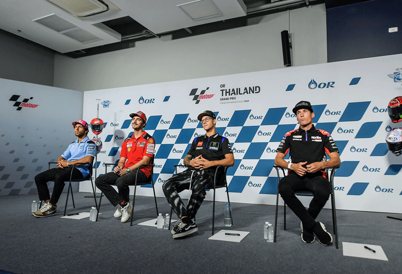 นักบิดดาวดังโมโตจีพีลงสำรวจแทร็กสนามช้าง เซอร์กิต ท่ามกลางสายฝนก่อนดวลเดือด “โออาร์ ไทยแลนด์ กรังด์ปรีซ์” สุดสัปดาห์นี้ ขณะตัวเต็งลุ้นแชมป์โลกมั่นใจ “ไต้ฝุ่นโนรู” ไม่กระทบการแข่งขัน ด้านฝ่ายยจัดเดินหน้าฝ่าพายุฝนจัดเตรียมงานกันอย่างหนัก เพื่อบิ๊กอีเว้นต์มอเตอร์สปอร์ตเบอร์หนึ่งของโลกที่ทุกคนรอคอยมากว่า 2 ปี
