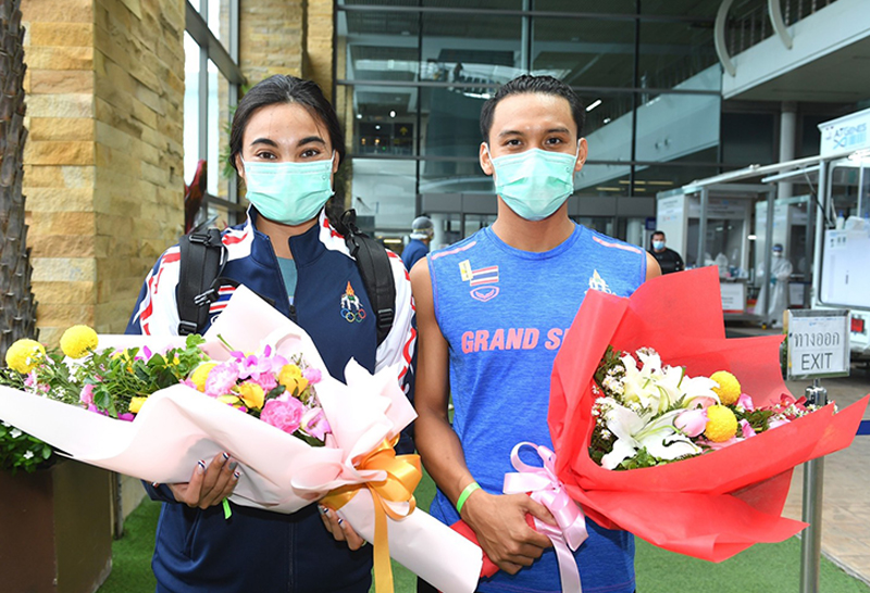 "ไวน์" นวพรรษ และ "จอย"เจนจิรา นักว่ายน้ำชุดโอลิมปิก2020 เดินทางกลับถึงไทย รองผู้ว่าการ กกท. รอต้อนรับ