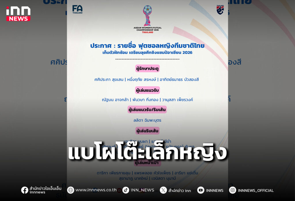 ประกาศรายชื่อ 20 แข้ง ฟุตซอลหญิงทีมชาติไทย เก็บตัวฝึกซ้อม เตรียมลุยศึกชิงแชมป์อาเซียน 2026
