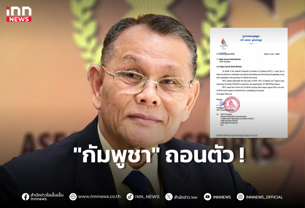 APSF ยืนยันได้รับหนังสือจากคณะกรรมการพาราลิมปิกแห่งชาติกัมพูชา แจ้งถอนตัวจากการแข่งขันกีฬาอาเซียนพาราเกมส์ ครั้งที่ 13 ที่จังหวัดนครราชสีมา ระหว่างวันที่ 20–26 มกราคม 2569 พร้อมย้ำการแข่งขันยังคงจัดขึ้นตามกำหนดเดิม