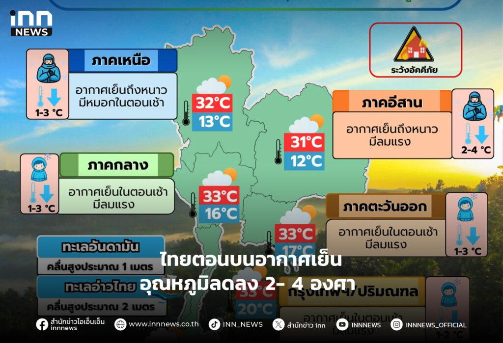 ไทยตอนบนอากาศเย็นอุณหภูมิลดลง 2- 4 องศา