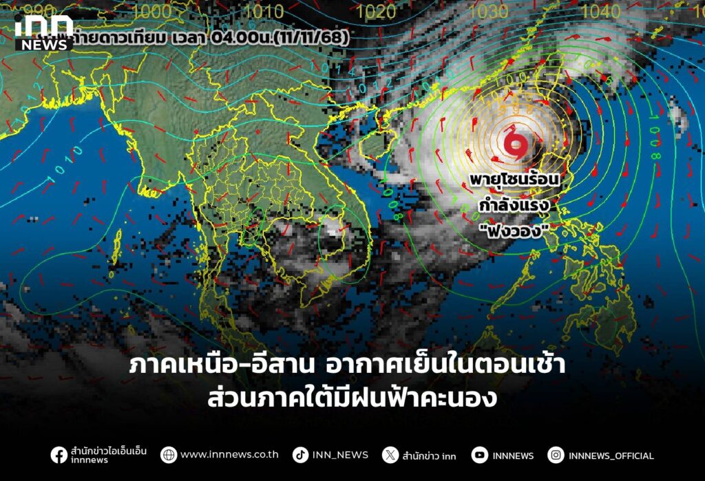 กรมอุตุ เผย ภาคเหนือ ภาคอีสาน อากาศเย็นในตอนเช้า ส่วนภาคใต้มีฝนฟ้าคะนอง ทะเลคลื่นสูง 1-2 เมตร พายุ"ฟงวอง"เคลื่อนเข้าไต้หวัน 12-13 พ.ย.