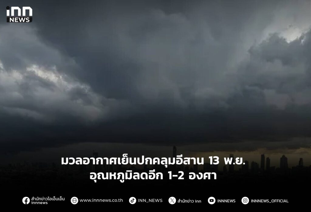 กรมอุตุฯ เผยประเทศไทยตอนบนยังมีฝนฟ้าคะนองบางแห่ง มวลอากาศเย็นปกคลุมอีสาน 13 พ.ย. อุณหภูมิลดอีก 1-2 องศา