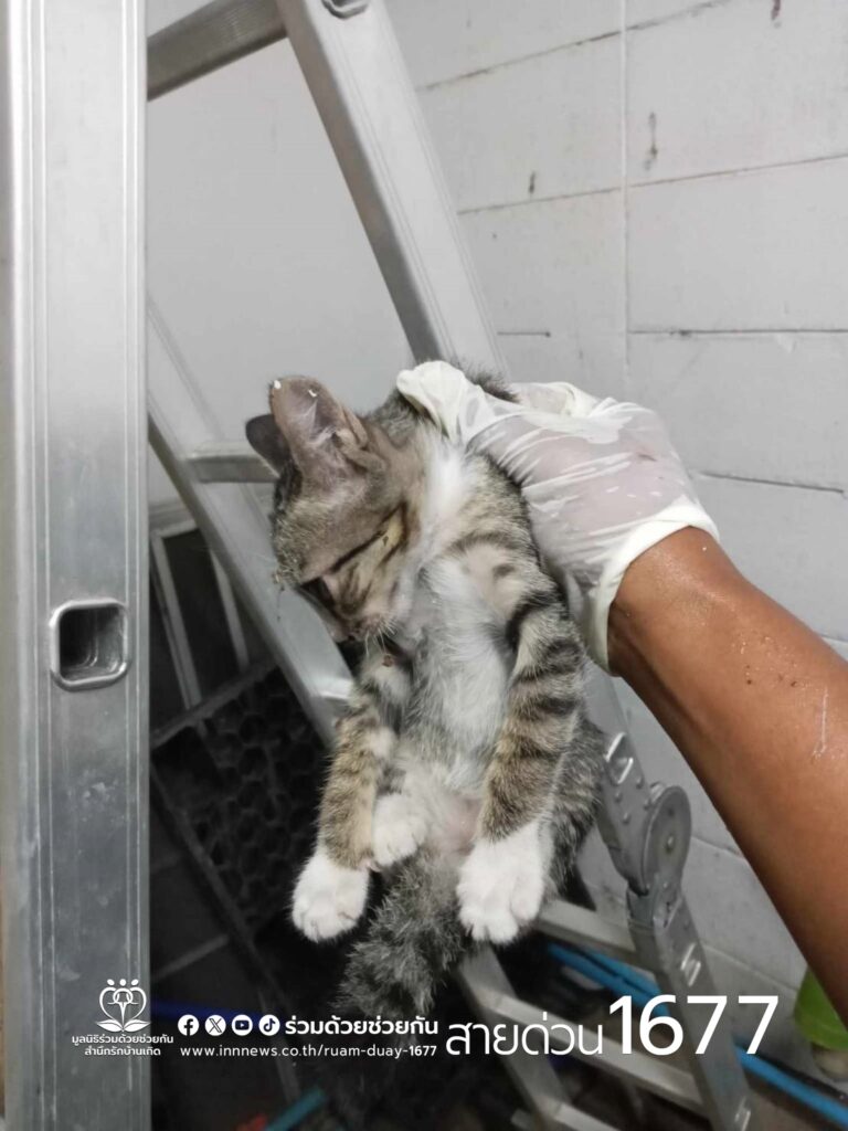 ลูกแมวจรจัดตกจากหลังคาบ้าน โทร.1677 ร่วมด้วยช่วยกัน ประสานอาสาช่วยเหลือนำส่งคืนแม่แมว