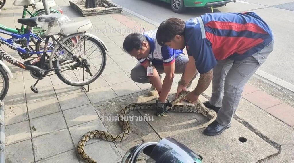 งูเหลือมติดท่อระบายน้ำ ซอยคู้บอน 1 อาสาช่วยออกมาได้ปลอดภัย