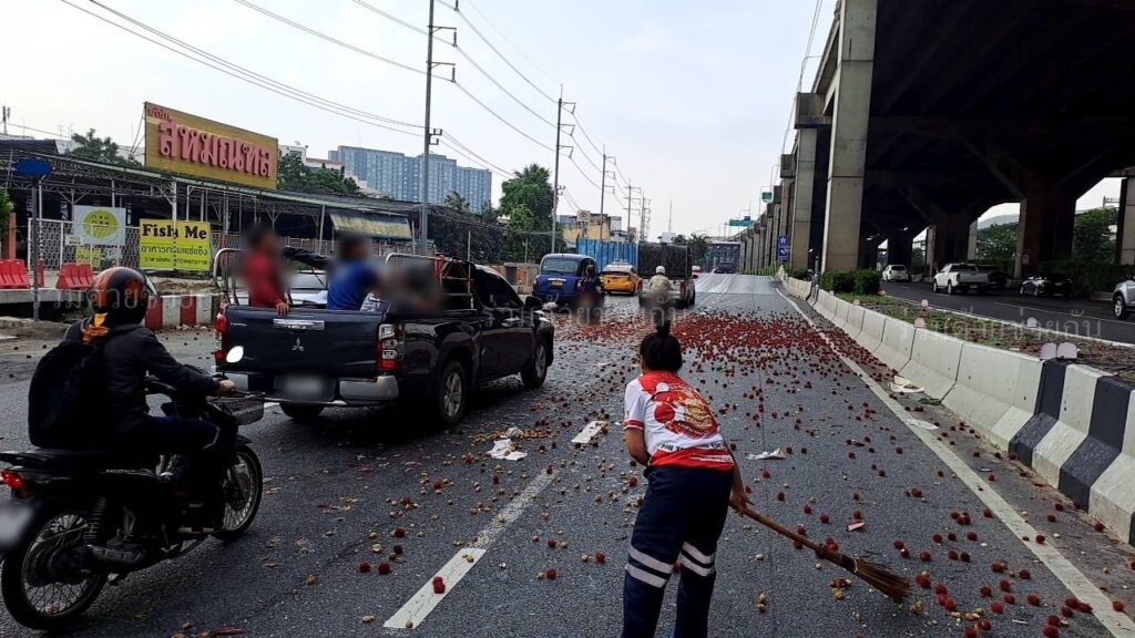 เตือนระวัง! ผลไม้ตกหล่นจำนวนมาก ถนนวิภาวดีรังสิต