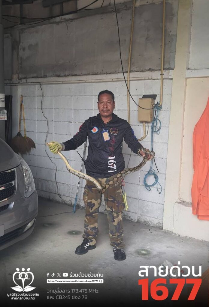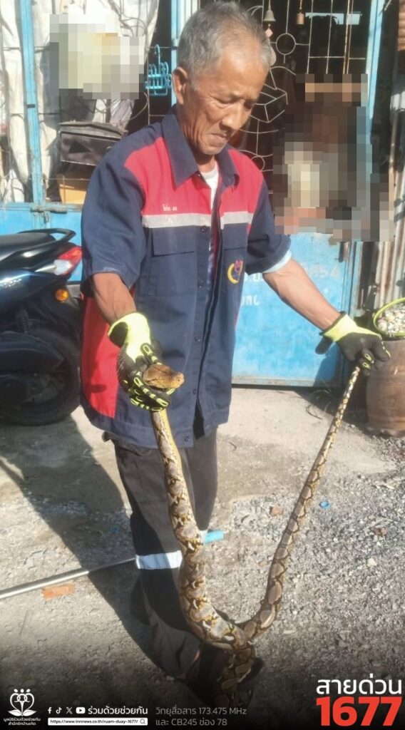ตกใจ! งูเหลือมท้องป่องซ่อนตัวในบ้านแมว ซอยนวลจันทร์ 14 อาสาร่วมด้วยเร่งช่วยเหลือ