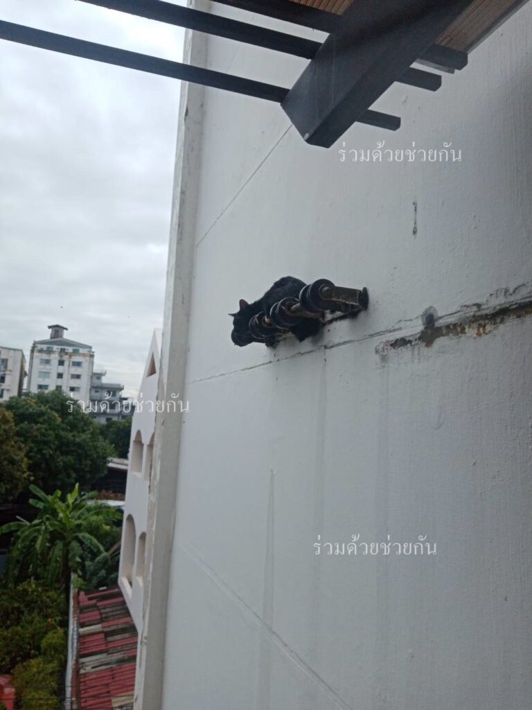 แมวขึ้นไปติดอยู่บนเหล็กร้อยสายไฟที่ติดอยู่ผนังอาคาร ได้รับการช่วยเหลือแล้ว