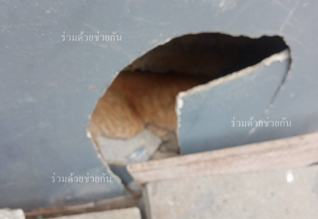 แมวป่วยวิ่งหนีเข้าไปติดในซอกอาคาร นำออกไม่ได้ โทร.1677 ร่วมด้วยช่วยกัน ประสานอาสาเข้าช่วยเหลือ