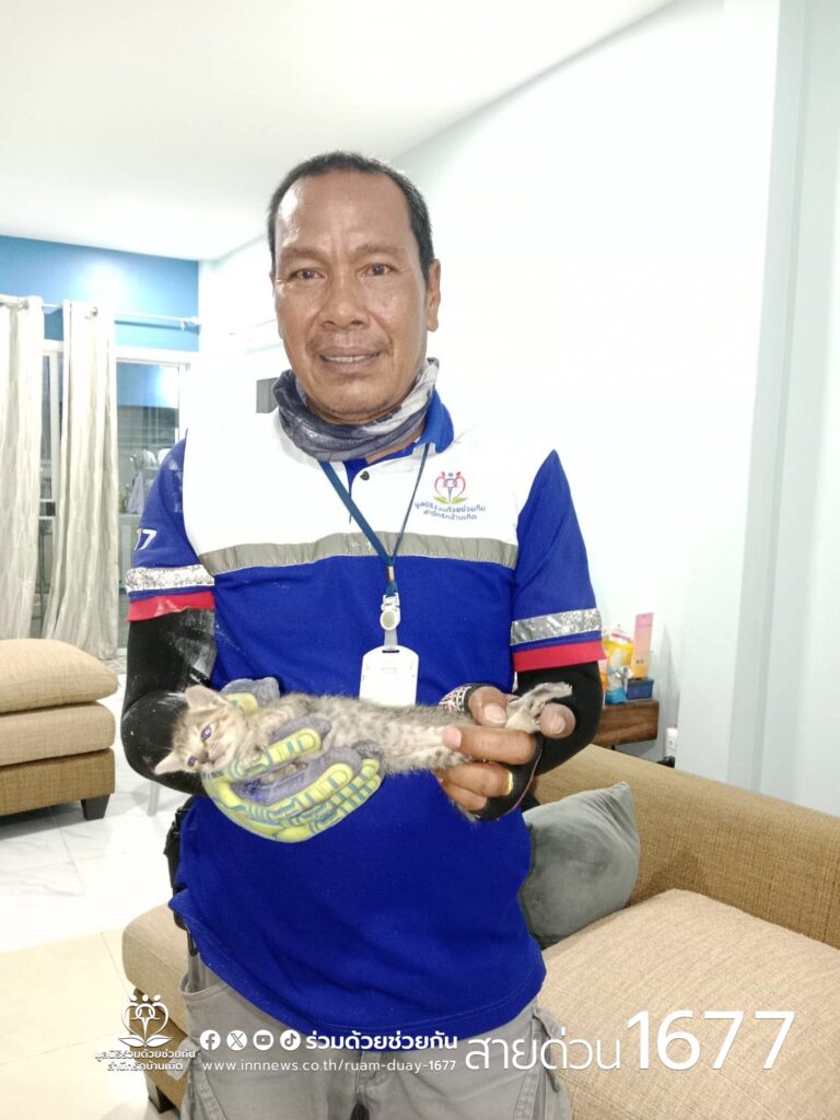 ประชาชนโทร.1677 ขอความช่วยเหลือ แม่แมวจรคาบลูกขึ้นไปติดอยู่บนฝ้าเพดานบ้าน ซอยพระยาสุเรนทร์ 28 ร่วมด้วยช่วยกัน ประสานอาสาร่วมด้วยเข้าช่วยเหลือ
