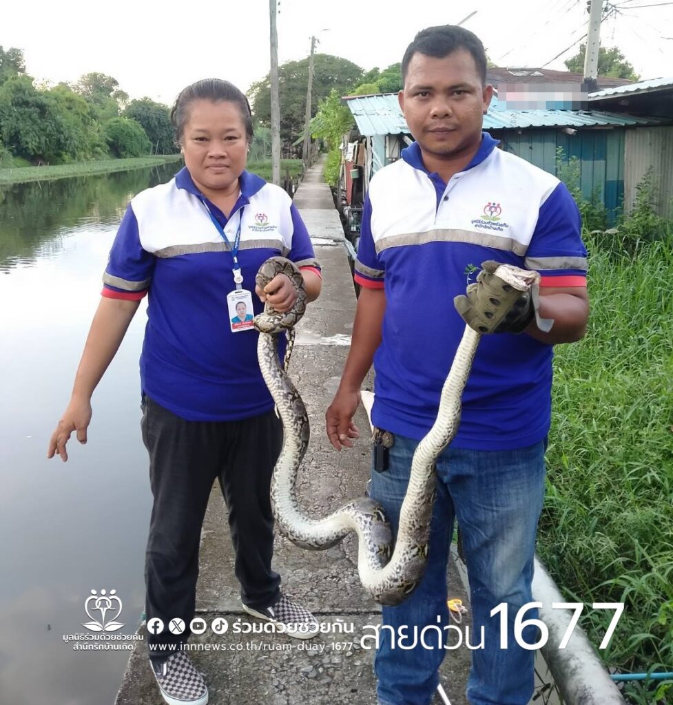 งูเหลือมซ่อนตัวอยู่ในกองไม้กองสังกะสีข้างกำแพงบ้าน ซอยพระยาสุเรนทร์ 30 อาสาร่วมด้วยเร่งช่วยเหลือ