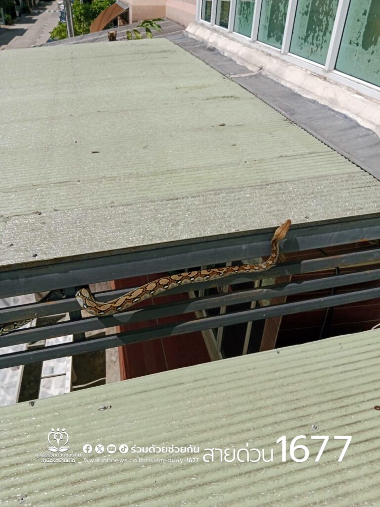กลัวงูเข้าบ้าน! พบงูเหลือมเลื้อยขึ้นหลังคาโรงรถ แจ้งอาสาฯจับ