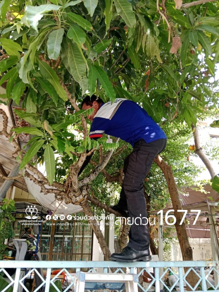 อาสาร่วมด้วยฯ ช่วยจับงูเหลือมยาว 3 เมตรซ่อนตัวบนรางน้ำฝน