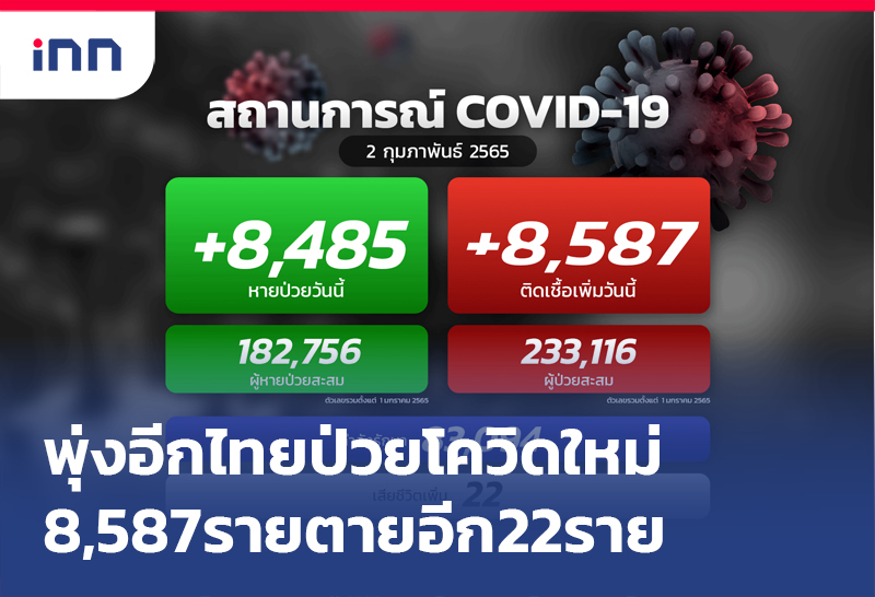 พุ่งอีก!ป่วยโควิดใหม่ 8,587 ราย ในประเทศ 8,456 ราย มาจากต่างประเทศ 131 ราย เสียชีวิต 22 ราย ขณะรักษาหาย 8,485 ราย เหลือรักษาตัว ในรพ. 83,094 คน