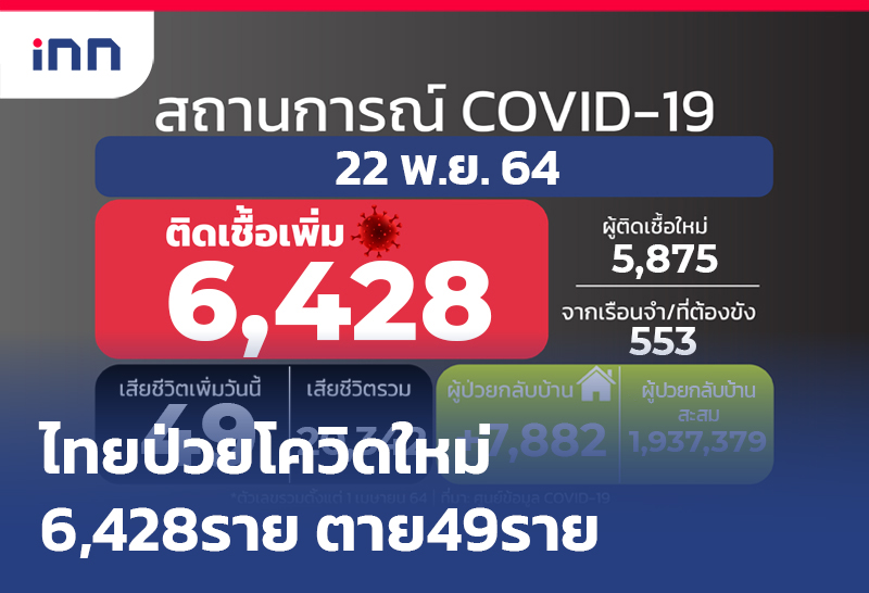 ลดลง! ป่วยโควิดใหม่ 6,428 ราย สะสม 2,071,009 ราย ไม่นับ ATK อีก 1,507 ขณะเสียชีวิต 49 ราย รักษาหาย 7,882 ราย เหลือรักษาตัวใน รพ. 85,768 คน