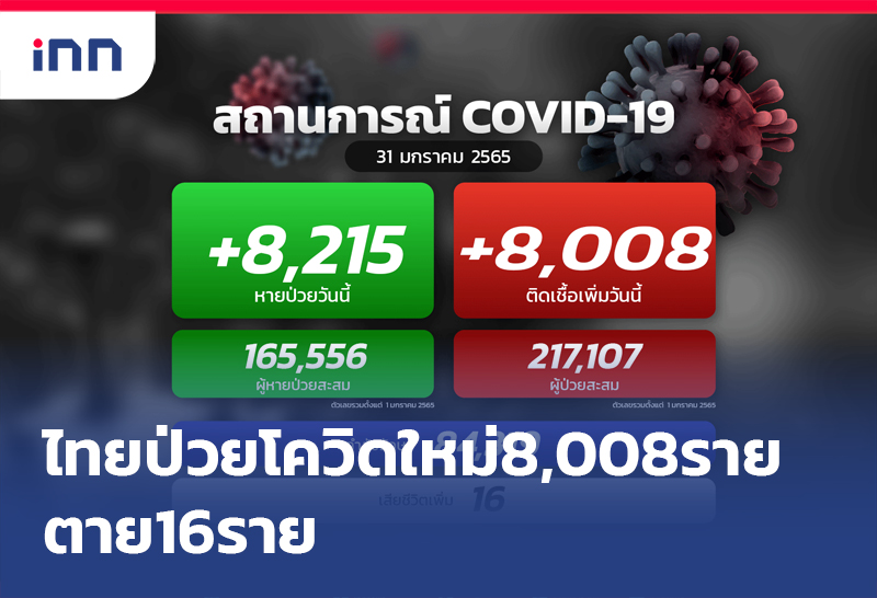 ลดต่อเนื่อง!ป่วยโควิดใหม่ 8,008 ราย ในประเทศ 7,842 ราย มาจากต่างประเทศ 166 ราย เสียชีวิต 16 ราย ขณะรักษาหาย 8,215 ราย เหลือรักษาตัว ในรพ.84,319 คน