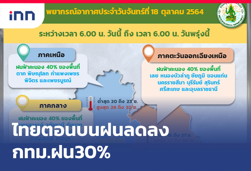 กรมอุตุนิยมวิทยา เผย ไทยตอนบนฝนลดลงแต่ยังมีฝนตกบางพื้นที่ เหนือ อีสาน กลาง ตะวันออกและใต้ กทม.มีฝน 30%