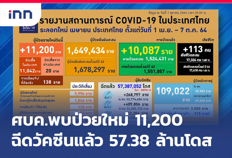 ศบค.พบป่วยใหม่ 11,200 ราย ตายอีก 113 รักษาหาย 10,087 เหลือรักษรตัว ในรพ.109,022 ราย ฉีดวัคซีนแล้ว 57.38 ล้านโดส