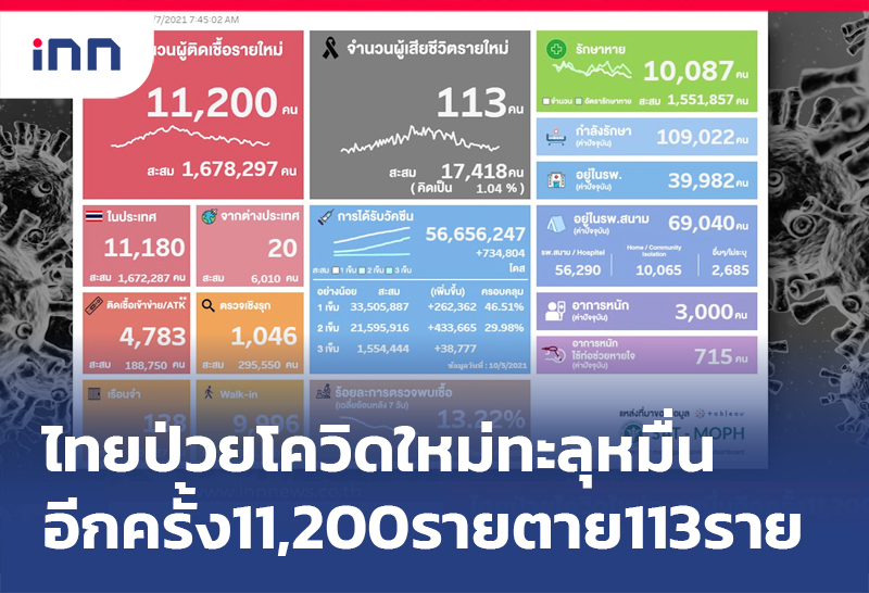 พุ่งจ้า!ป่วยโควิดใหม่ทะลุหมื่นอีกครั้ง 11,200 ราย สะสม 1,678,297 ราย เสียชีวิต 113 ราย รักษาหาย 10,087 ราย เหลือรักษาในรพ.109,022 คน