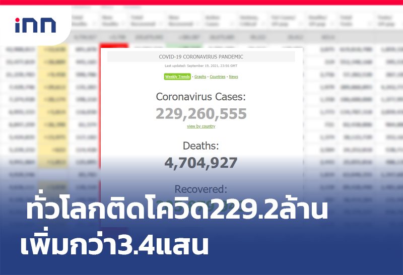 ทั่วโลกติดโควิดสะสม 229.2 ล้านราย เพิ่มกว่า 3.4 แสน สหรัฐฯป่วยเพิ่มอีก 32,638 ส่วนอินเดียป่วยเพิ่มอีก30,809 คน