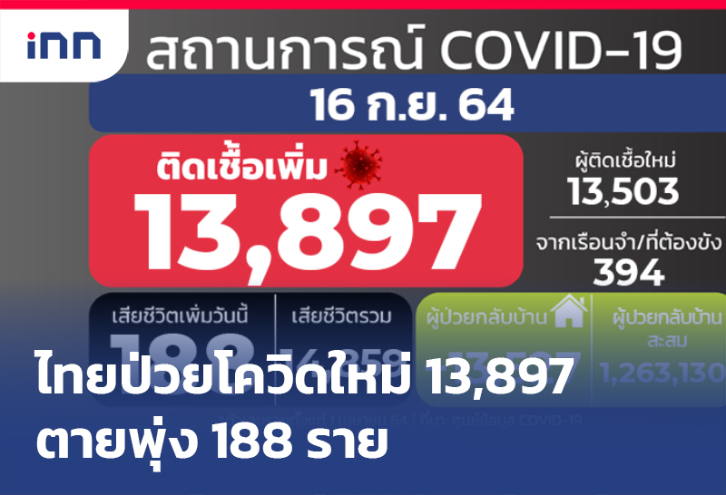 เพิ่มอีกแล้ว! ป่วยโควิดใหม่ 13,897 ราย สะสม 1,434,237 ราย เสียชีวิตพุ่ง 188 ราย ขณะรักษาหายลดลง 13,527 ราย เหลือรักษาในโรงพยาบาล 128,728 คน