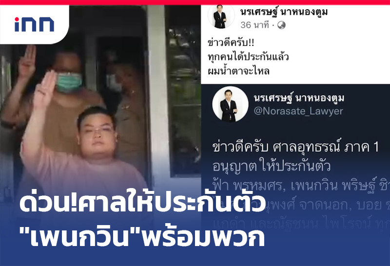 ทนายโพสต์แจง ศาลอุทธรณ์ภาค1ให้ประกันตัวแกนนำม็อบ “เพนกวิน-ฟ้า พรหมศร-ไมค์-บอย-ณัฐ” พร้อมปล่อยตัววันนี้