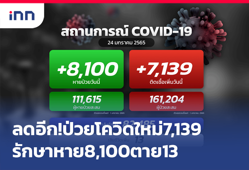 ลดอีก!ป่วยโควิดใหม่ 7,139 ราย ในประเทศ 6,944 ราย มาจากต่างประเทศ 195 ราย เสียชีวิต 13 ราย ขณะรักษาหาย 8,100 ราย เหลือรักษาตัว ในรพ.82,485 คน