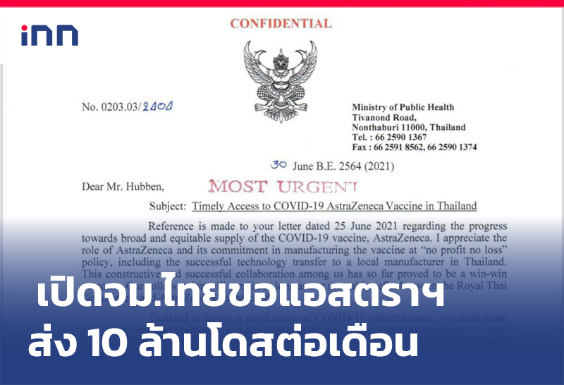 เปิด จม.ฝั่งไทย ขอ "แอสตราฯ" ส่ง 10 ล้านโดสต่อเดือน หลังโซเชียลปั่นหนัก ไทยต้องการแค่ 3 ล้านโดส