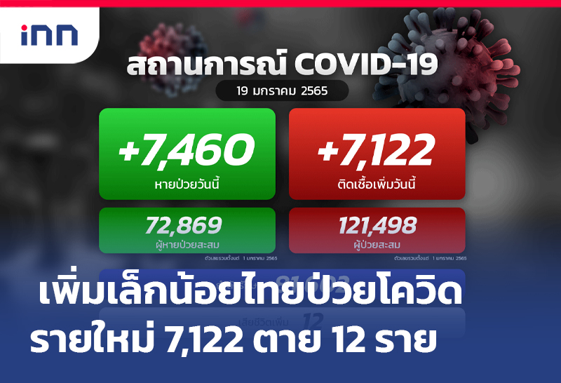 เพิ่มเล็กน้อย ไทยป่วยโควิดใหม่ 7,122 ราย ในประเทศ 6,950 ราย มาจากต่างประเทศ 172ราย เสียชีวิต 12 ราย ขณะรักษาหาย 7,460 ราย เหลือรักษาตัว ในรพ. 81,602 คน