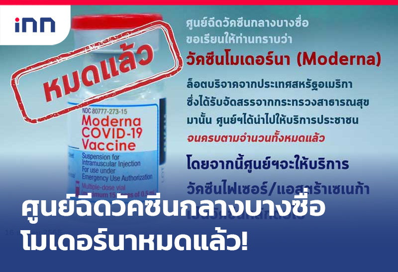 ศูนย์ฉีดวัคซีนกลางบางซื่อ ประกาศ ‘วัคซีนโมเดอร์นา’ ลอตสหรัฐฯบริจาคให้บริการปชช.หมดแล้วจากนี้ประกาศใช้ ‘ไฟเซอร์ - แอสตร้าฯ’ เป็นหลัก