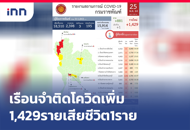 กรมราชทัณฑ์รายงานพบผู้ต้องขังติดเชื้อรายใหม่ 1,429 ราย เสียชีวิตเพิ่ม1 ราย