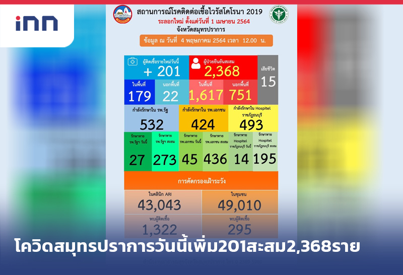 สมุทรปราการ โควิดวันนี้ 201 ราย ยอดสะสม 2,368 ราย อำเภอพระสมุทรเจดีย์ ติดเชื้อพุ่ง 128 ราย