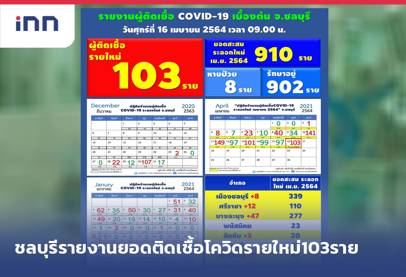 ชลบุรี รายงานยอดผู้ติดเชื้อโควิด-19 รายใหม่ของวันที่ 16 เม.ย. 64 พบ 103 ราย