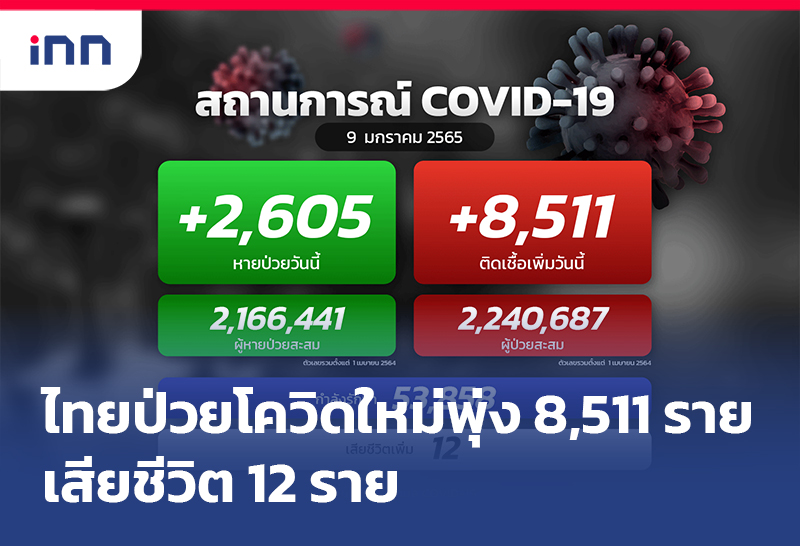 พุ่งอีก! ป่วยโควิดใหม่ 8,511 ราย มาจากต่างประเทศ 350 ราย เสียชีวิต 12 ราย ขณะรักษาหาย 2,605 ราย เหลือรักษาตัว ในรพ. 53,858 คน