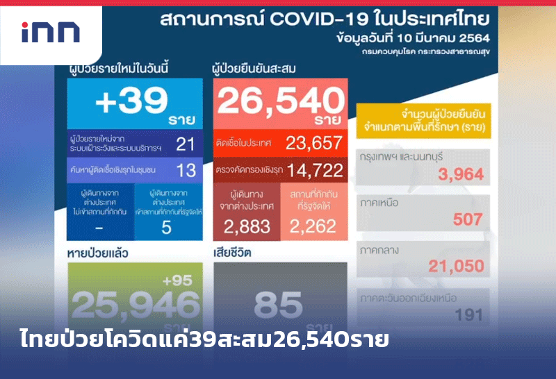 ศบค.เผย ไทยป่วยโควิดแค่ 39 ราย ติดในประเทศ 34 ราย สะสม 26,540 ราย