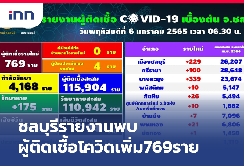 จ.ชลบุรีรายงาน พบผู้ติดเชื้อโควิด-19 รายใหม่ จำนวน 769 ราย