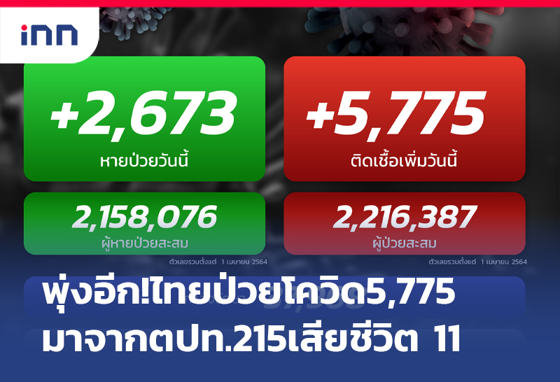 พุ่งอีก! ป่วยโควิดใหม่ 5,775 ราย มาจากต่างประเทศ 215 ราย เสียชีวิต 11 ราย ขณะรักษาหาย 2,673 ราย เหลือรักษาตัว ในรพ. 37,968 คน