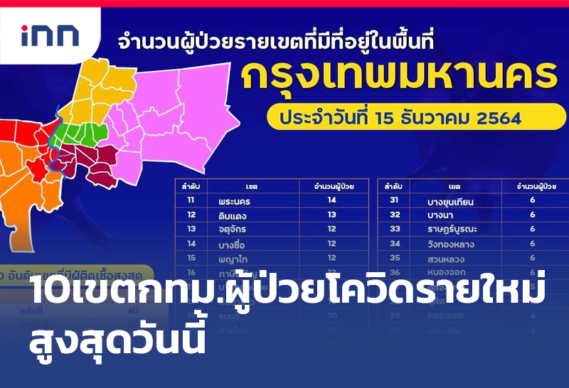 กทม.เผยข้อมูล 10 อันดับเขตในกรุงเทพมหานครที่มีผู้ป่วยโควิด-19 รายใหม่มากที่สุด เขตหลักสี่ เป็นอันดับ 1 จำนวนผู้ป่วยใหม่ 40 ราย