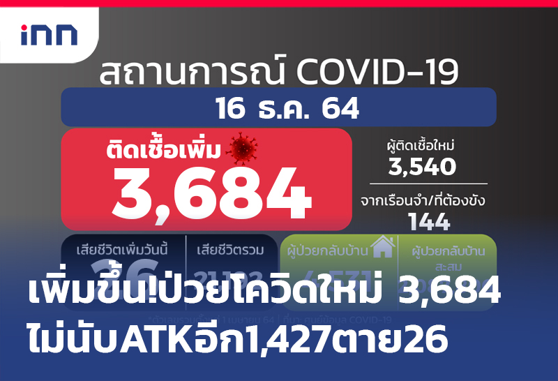 เพิ่มขึ้น! ป่วยโควิดใหม่ 3,684 ราย ไม่นับ ATK อีก 1,427 ราย สะสม 2,181,960 ราย ขณะเสียชีวิตอีก 26 ราย
