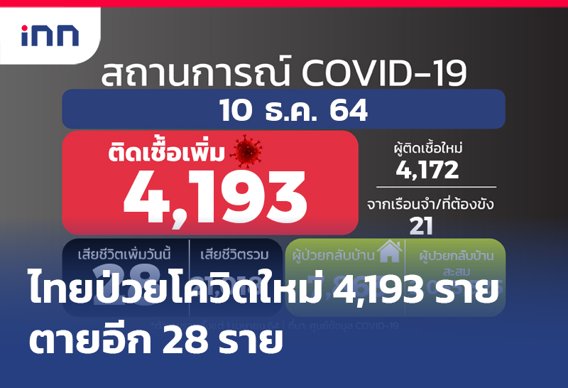 ทรงตัว!ป่วยโควิดใหม่ 4,193 ราย สะสม 2,160,780 ราย ไม่นับ ATK อีก 1,546 ราย ขณะเสียชีวิตเพิ่ม 28 ราย รักษาหาย 7,863 ราย เหลือรักษาตัวใน รพ. 56,717 คน