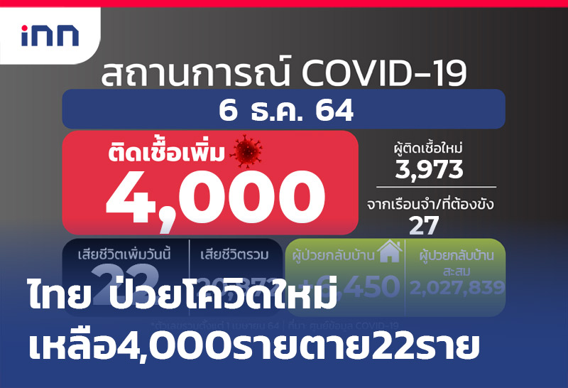 ลดอีก!ป่วยโควิดใหม่ 4,000 ราย สะสม 2,145,241 ราย ไม่นับ ATK อีก 1,157 ราย ขณะเสียชีวิต 22 ราย รักษาหาย 6,450 ราย เหลือรักษาตัวใน รพ. 69,010 คน