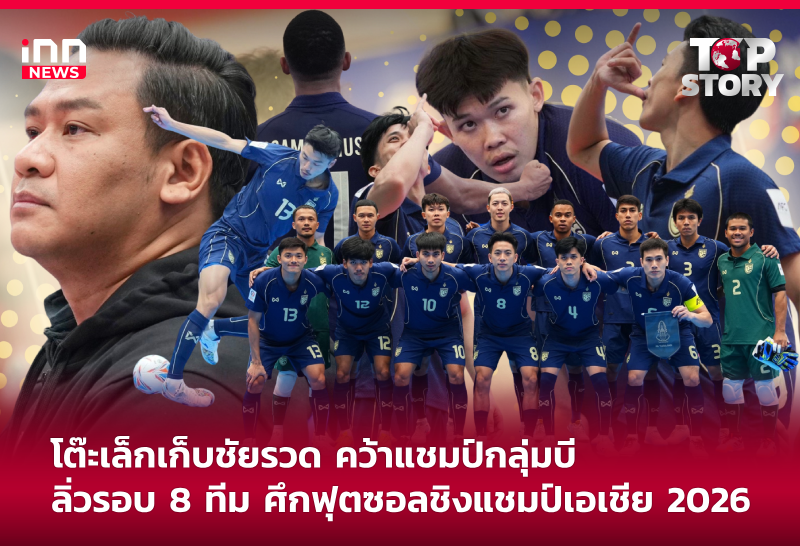 ฟุตซอลชายทีมชาติไทย ทำผลงานได้อย่างแข็งแกร่งในศึกฟุตซอลชิงแชมป์เอเชีย 2026 รอบแบ่งกลุ่ม กลุ่มบี หลังเก็บชัยชนะครบทั้ง 3 นัด คว้า 9 คะแนนเต็ม ผงาดคว้าแชมป์กลุ่มบี พร้อมผ่านเข้าสู่รอบก่อนรองชนะเลิศได้ตามเป้าหมายที่วางไว้